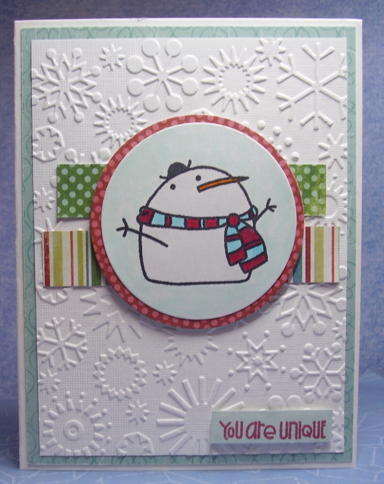 The snowman stamp and sentiment is from Paper Smooches - kinda reminds me of me - short and chunky. My nose is not that long though and I do not have a cap like that.