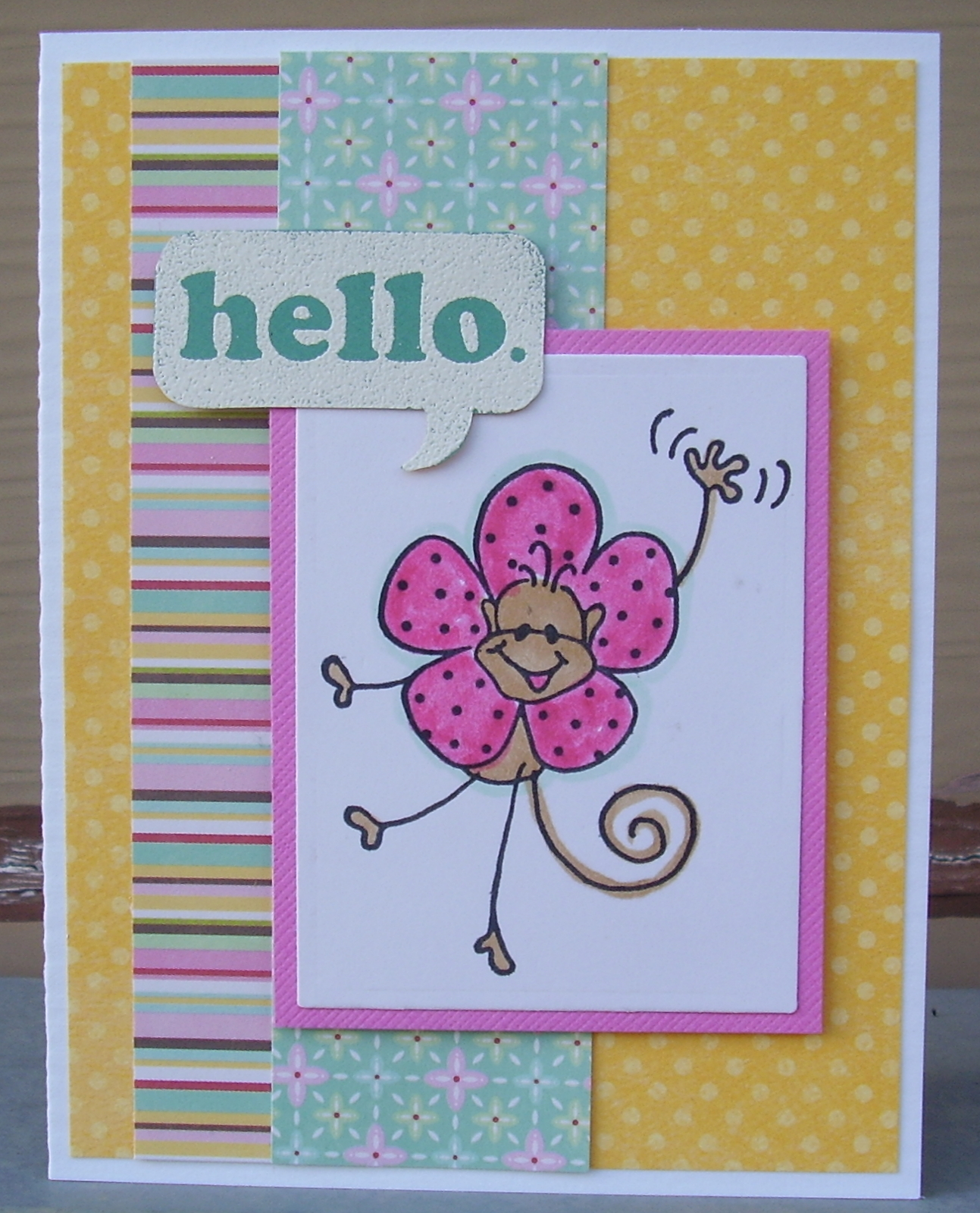 I wanted to send her a card with a happy image and some pretty bright colors on it. It is Oldie Moldie Monday so I dug back in some old supplies - I don't think this 6 x 6 pad has aged that well yet - but I know it is not brand new. It is from Basic Grey. The stamp is from a local stamp company - Cracker Box Palace. The sentiment is from Studio Calico - a set I got from a class I took "You've Got Mail".