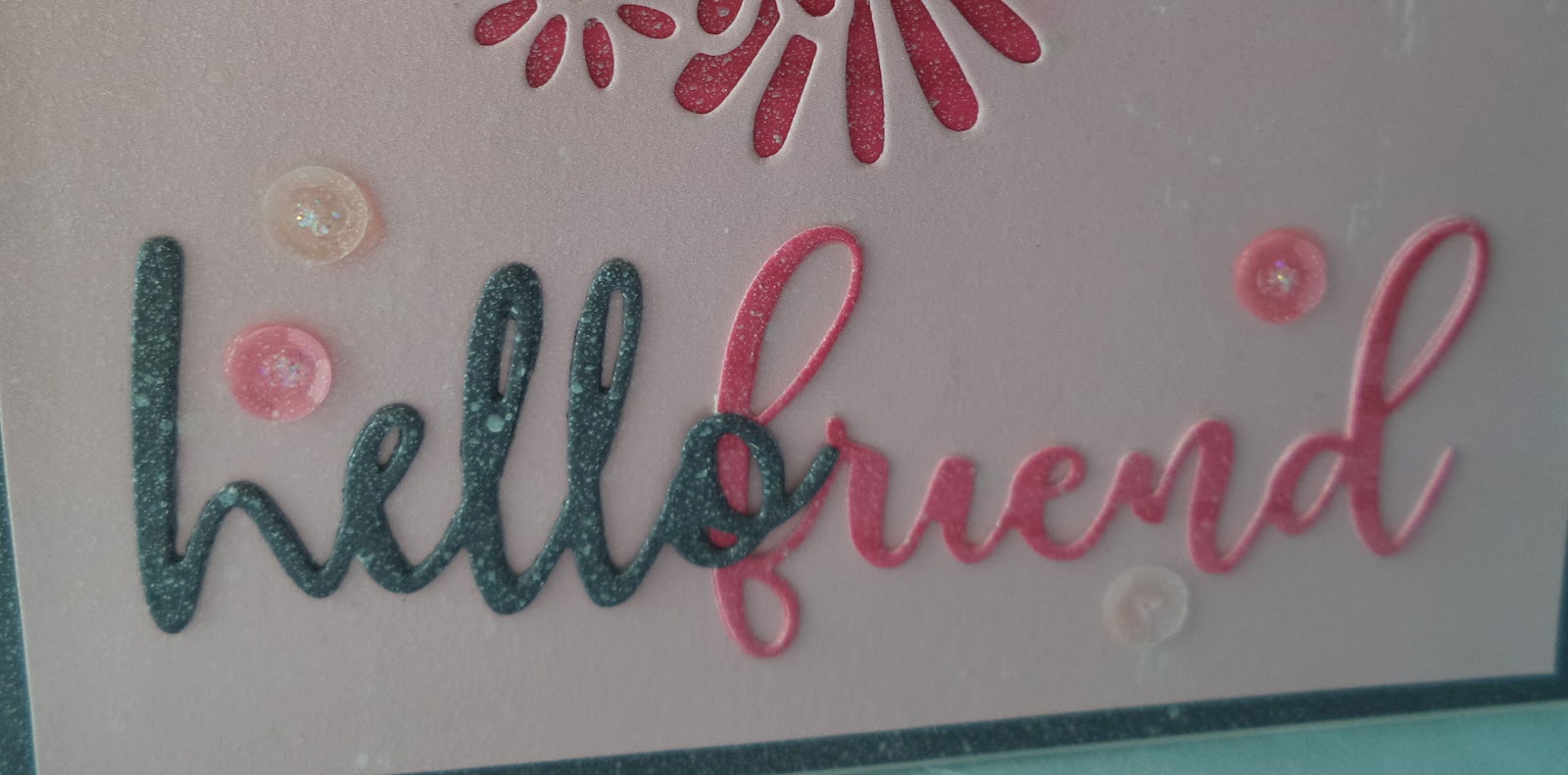Here is a close up of the sentiment. It did not quite fit perfectly across the bottom so I just overlapped the O on top of the f of friend - kinda puts an emphasis on the o in hello.